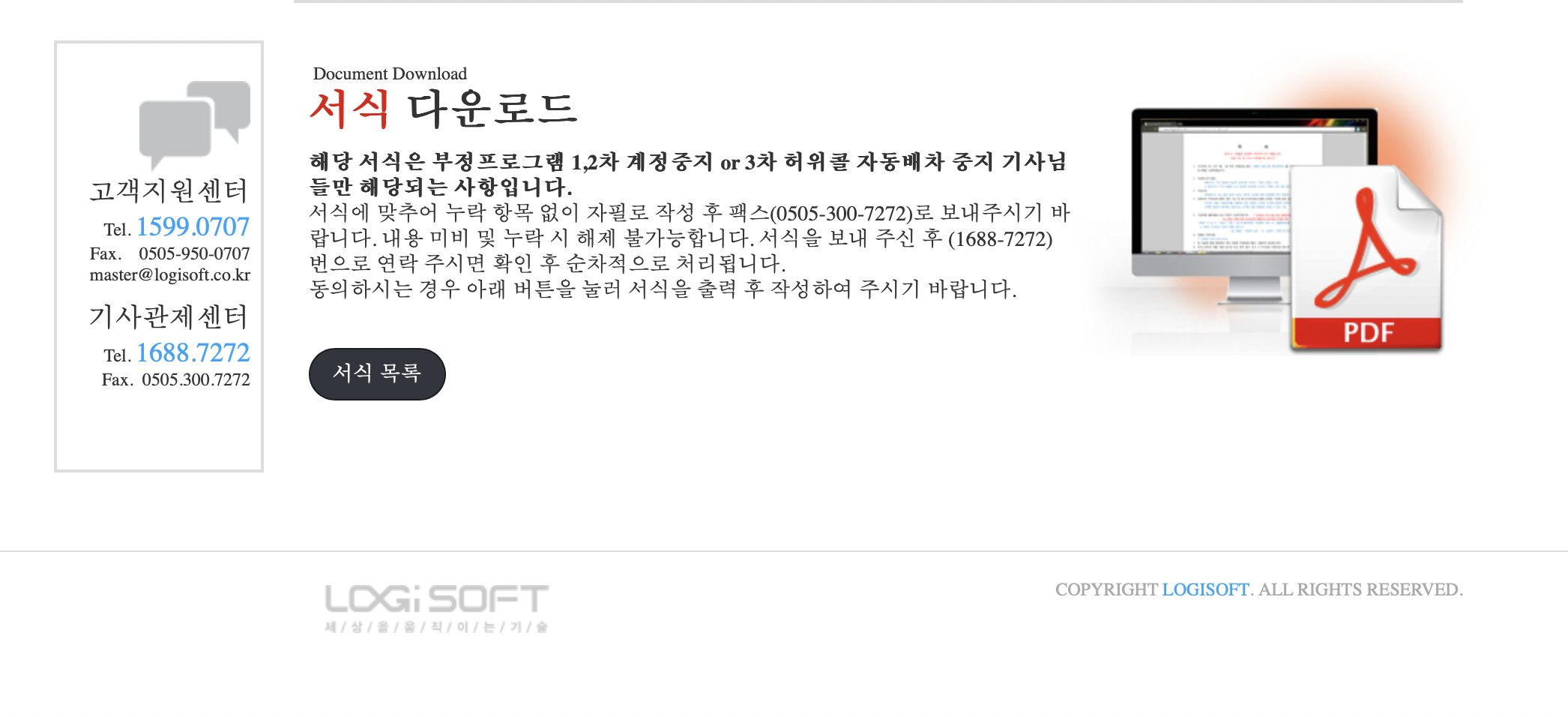 Document Download 서식 다운로드 해당 서식은 부정프로그램 1,2차 계정중지 or 3차 허위콜 자동배차 중지 기사님들만 해당되는 사항입니다. 서식에 맞추어 누락 항목 없이 자필로 작성 후 팩스(0505-30