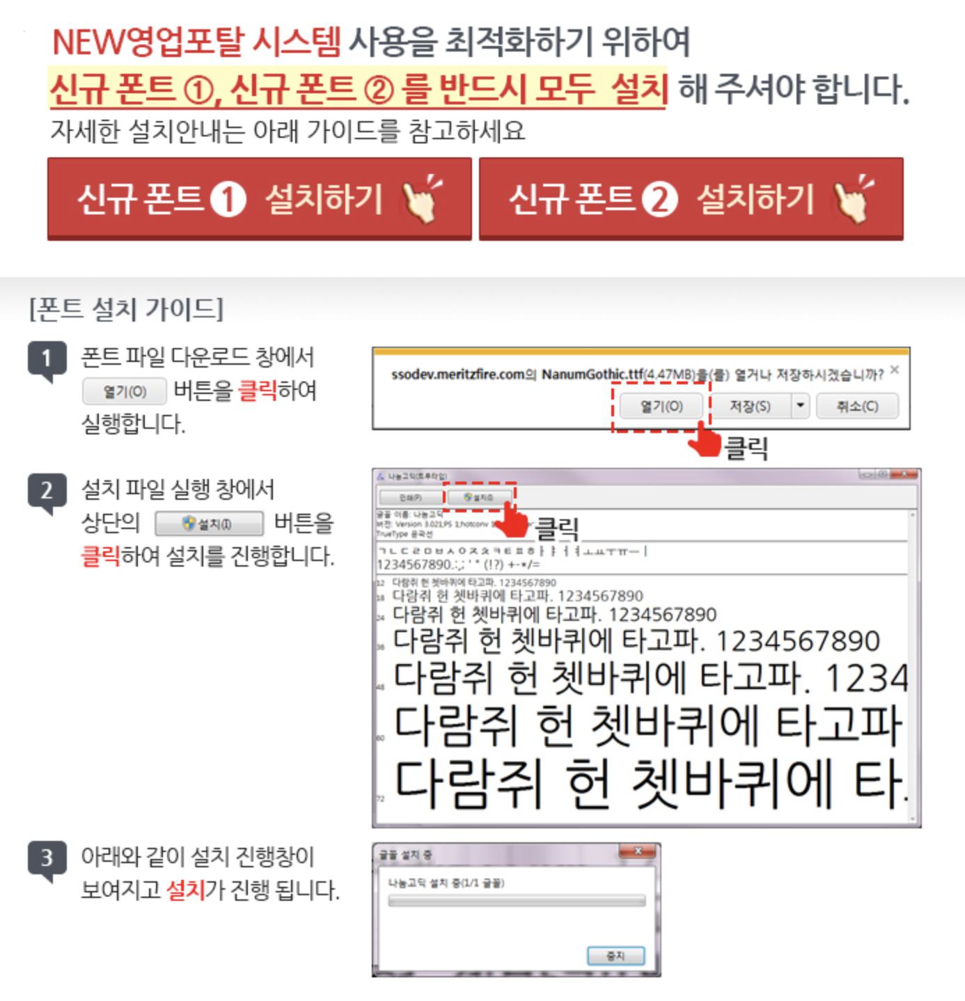 또한 신 영업포탈 시스템 최적화를 위해 신규폰트를 반드시 설치해주세요. 영업포탈 하단 다운로드 센터에서 폰트파일 다운로드를 열기 해서 설치하시면 됩니다.