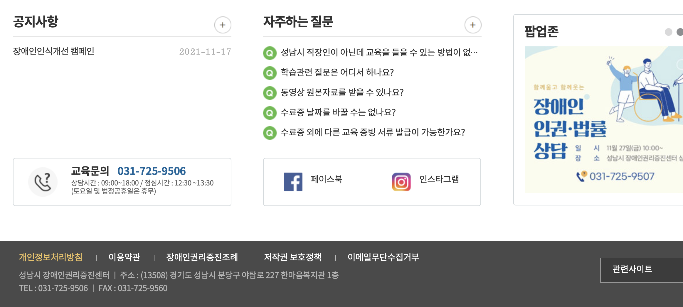성남시 장애인권리증진센터 원격교육, 직장 내 장애인 인식개선 교육, 교육신청, 나의 강의실, 교육소식