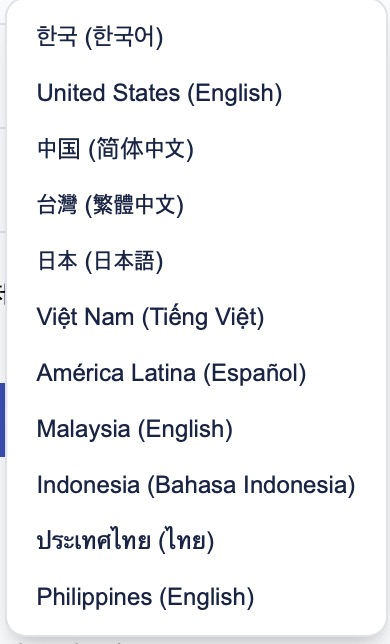 한국어, 영어, 중국어, 일본어, 베트남어, 스페인어 (남미), 말레이시아 영어, 인도네시아 바하사, 필리핀 영어