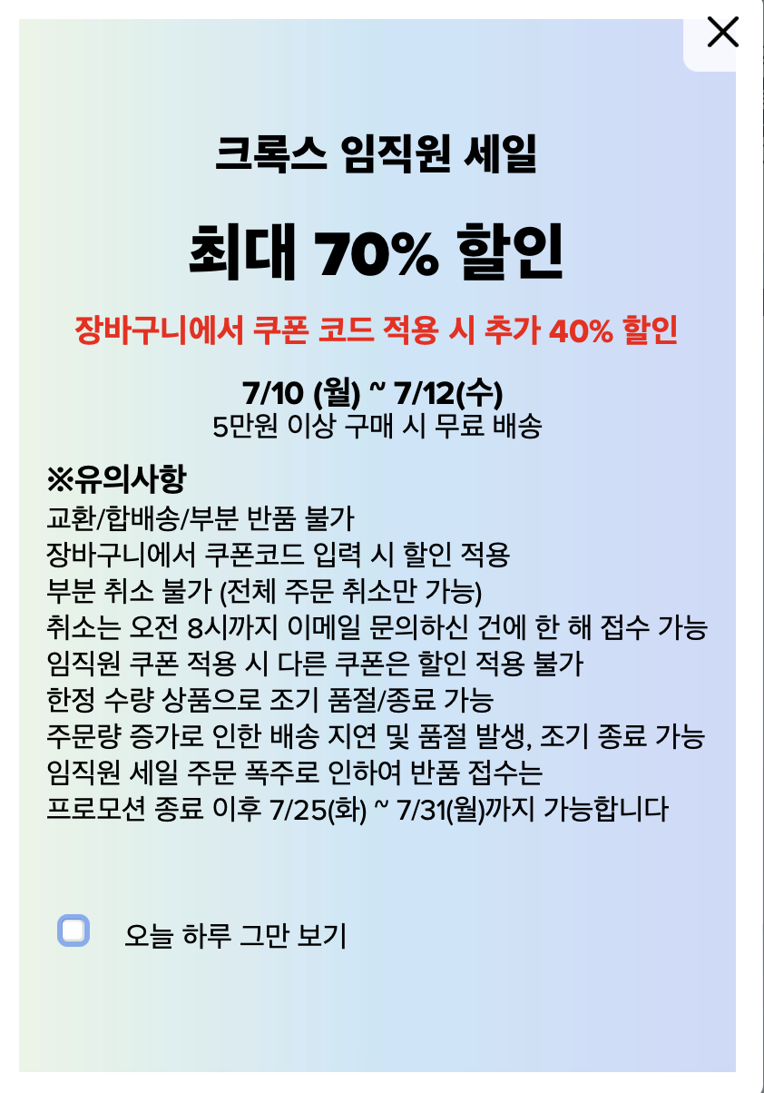 = 임직원세일이라고 거창한거 같지만, 거의 분기별로 매번 진행함. 크록스코리아만의 마케팅 비법임.